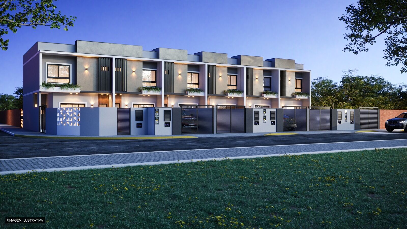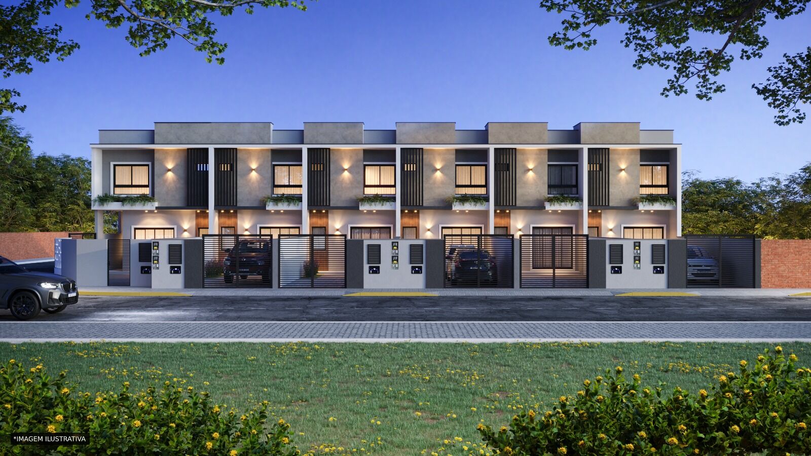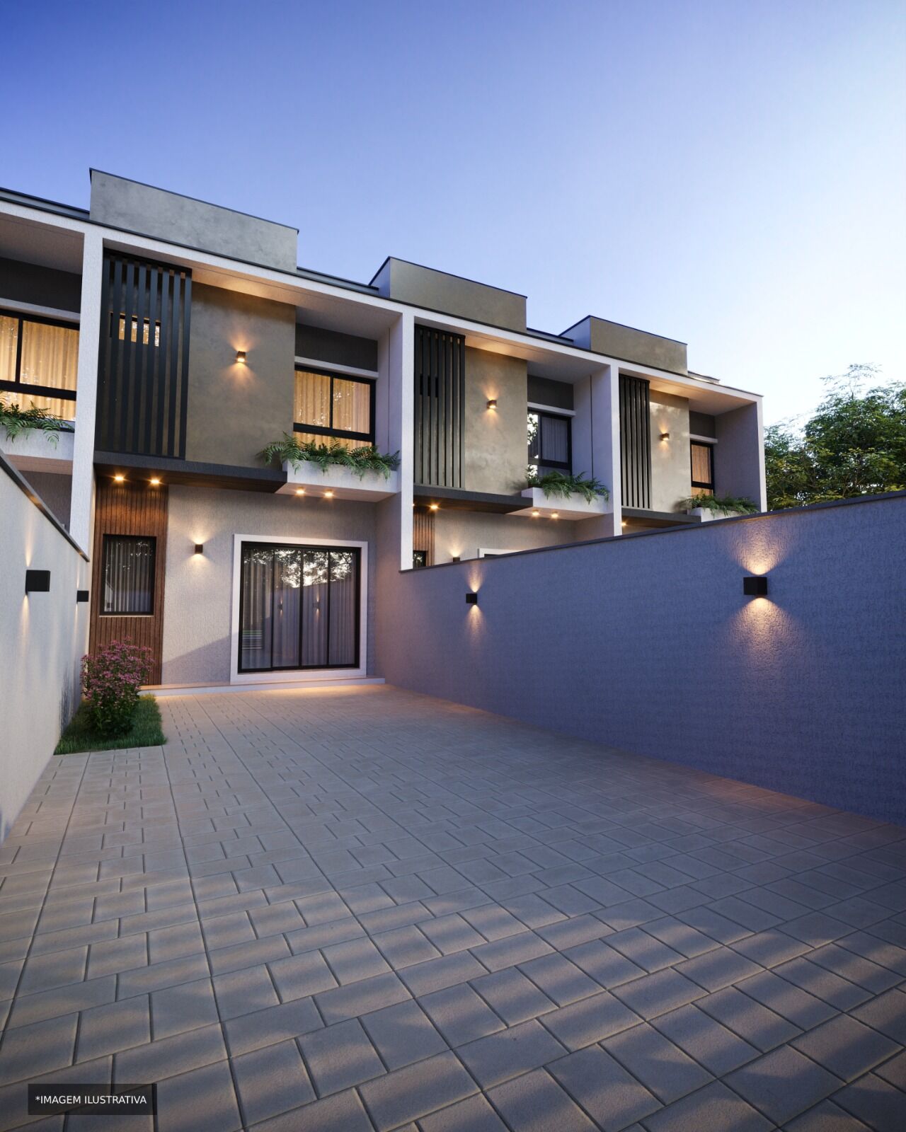 O geminado possui 2 suítes, lavabo, sala de estar, jantar e cozinha integrada, área de serviço e 2 vagas de garagem.