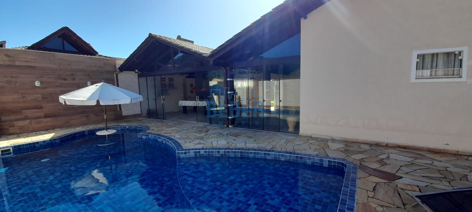 Com 350m² de área construída, a casa possui 1 suíte + 2 quartos, dois banheiros sociais, área de festas com piscina, garagem coberta para dois carros. Lote de 968m² todo cercado.